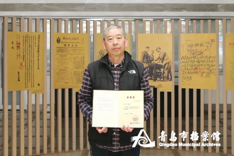 青岛档案馆工作人员对翟广顺的捐献表示感谢,并向翟广顺颁发收藏证书。