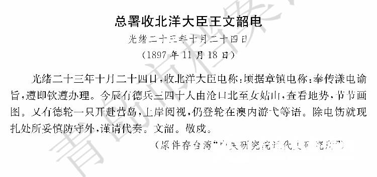• 作者:青岛市档案馆     文章来源:胶州湾事件档案史料汇编下册      形成日期:1897年11月18日