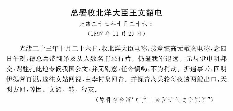 • 作者:青岛市档案馆     文章来源:胶州湾事件档案史料汇编下册      形成日期:1897年11月20日