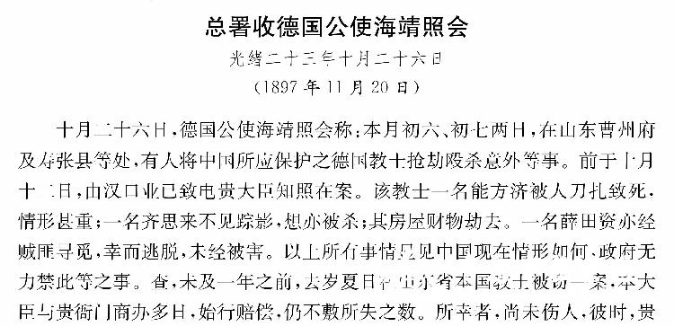 总署收德国公使海靖照会(光绪二十三年十月二十六日 1897年11月20日)