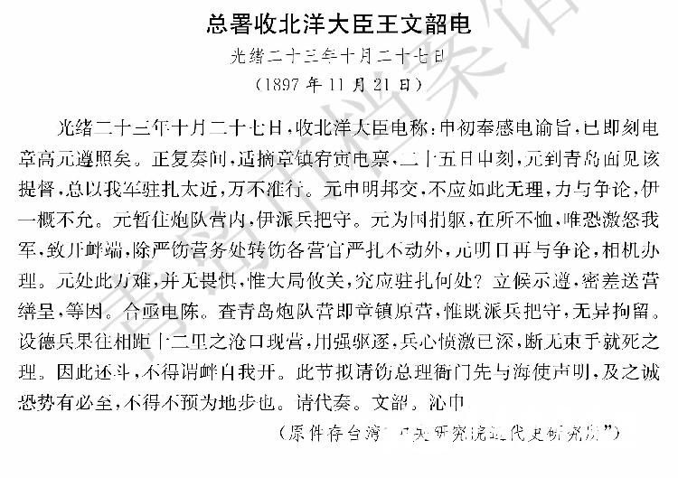 • 作者:青岛市档案馆     文章来源:胶州湾事件档案史料汇编下册      形成日期:1897年11月21日